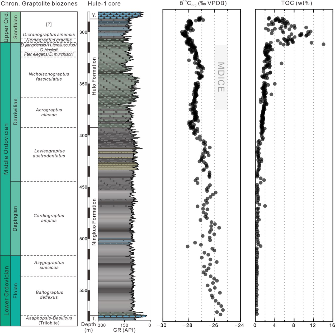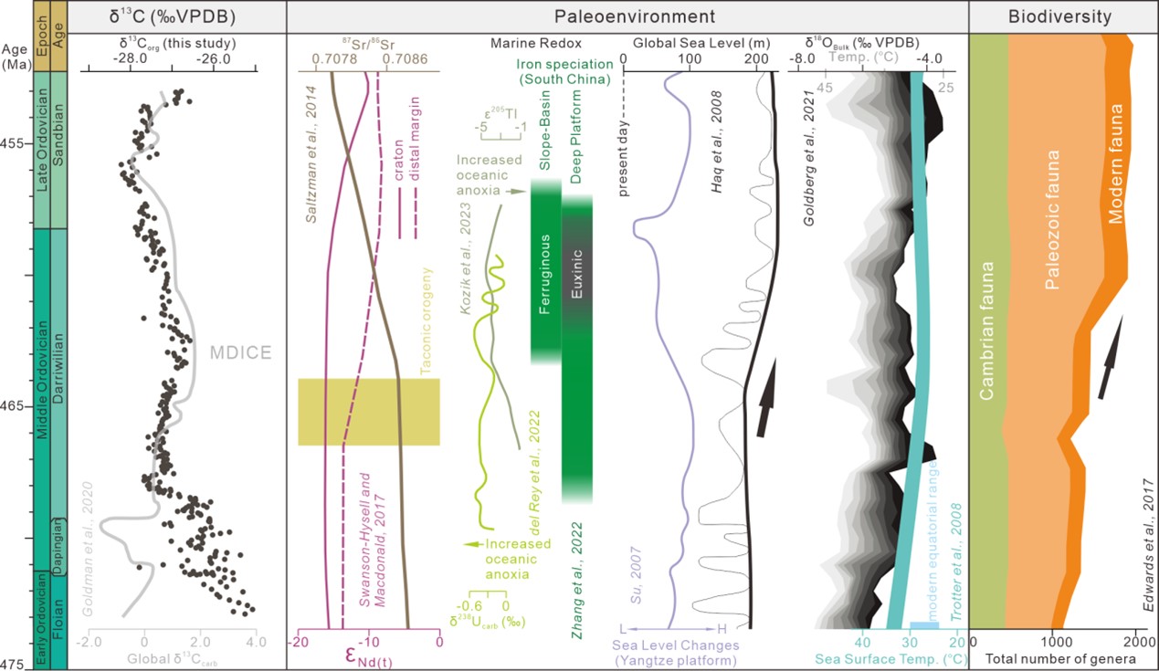 奥陶纪是地球生命演化的关键时期,并发生过一次全球性的碳同位素正漂移事件(达瑞威尔中期碳同位素漂移;MDICE),这对理解古气候与生物圈共演变机制提供了良好研究对象。但此前研究多聚焦δ13Ccarb记录,缺乏高精度的有机碳同位素地层学研究,限制了对奥陶纪生物与环境演化机制的认识。